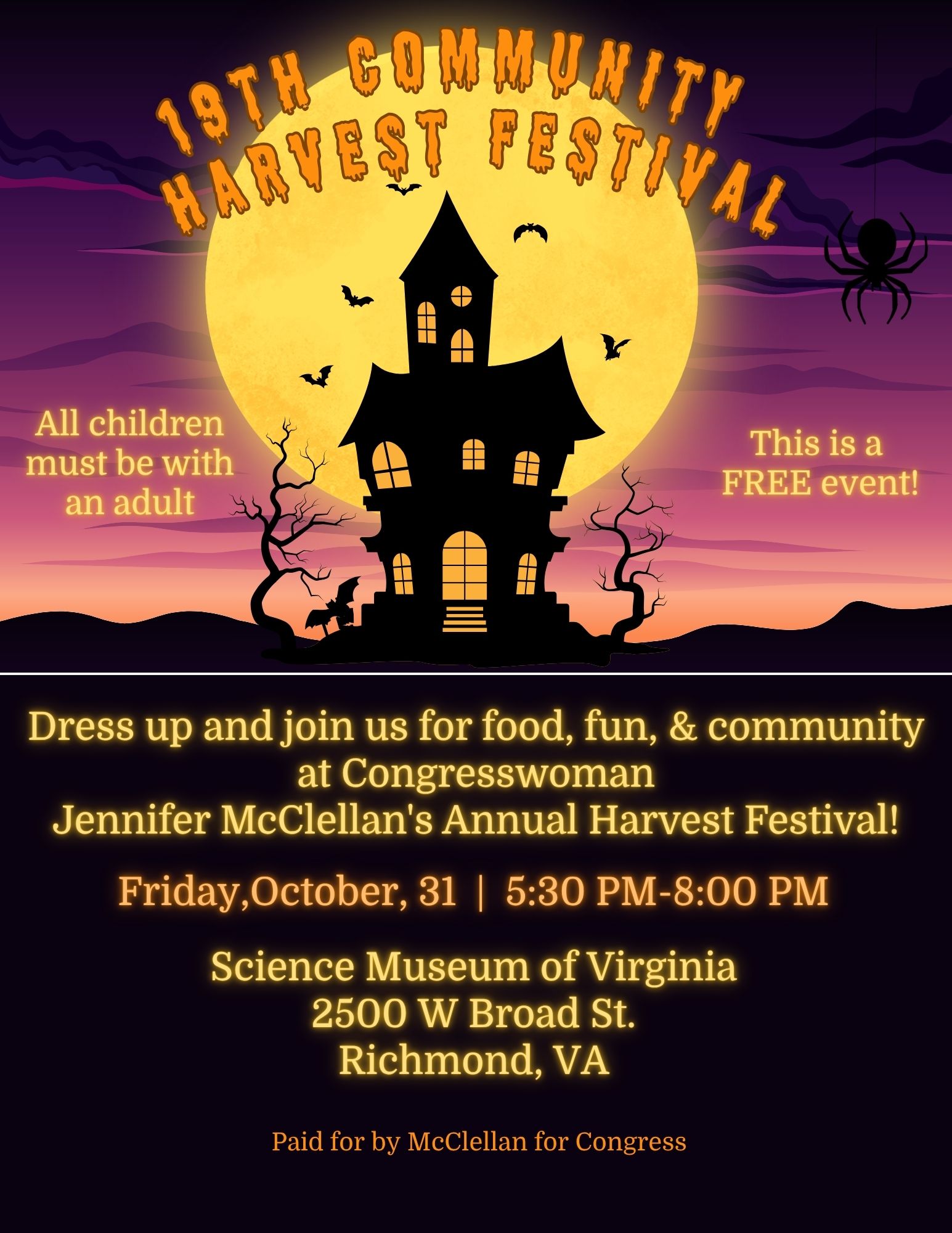 Congresswoman Jennifer McClellan will host her annual Harvest Festival at the Science Museum of Virginia, located at 2500 West Broad Street, Richmond, Virginia 23220, on October 31 from 5:30-8:00 PM.